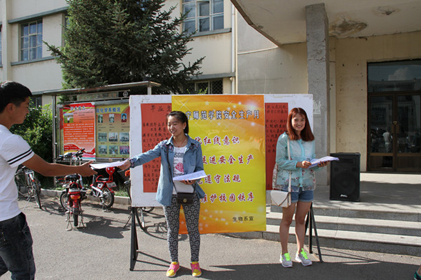 6月16日是全国安全生产月宣传咨询日,活动的主题是“坚守红线,从严执法”。根据校党委《关于开展2014年“安全生产月”活动的通知》精神,生物系党总支在培训实训中心教学楼前广场举行活动,为师生提供校园安全常识咨询,并发放“校园安全常识”宣传资料。