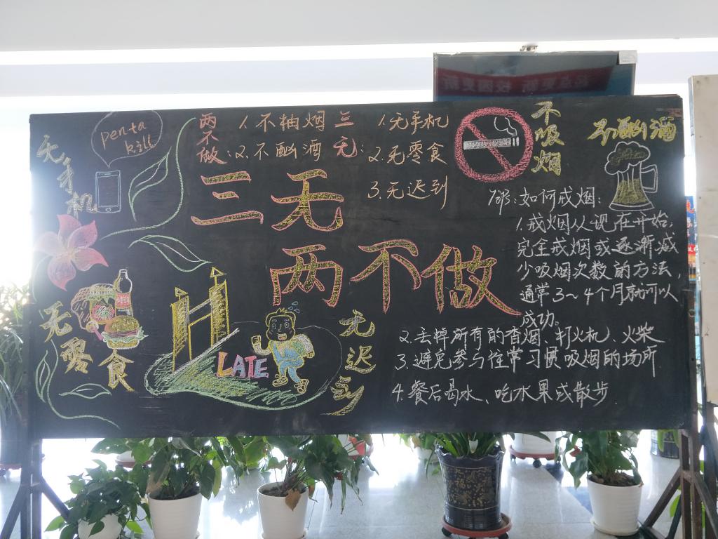 “三无”是指“无迟到”课堂,自觉遵守课堂纪律,不迟到,不早退,不随意旷课;“无手机”课堂,上课不携带手机,或上课前将手机调至静音或关机状态;“无食物”课堂,不把零食、饭菜带进教室,杜绝“饭香”掩盖“书香”。“两不做”包括不吸烟、不喝酒。