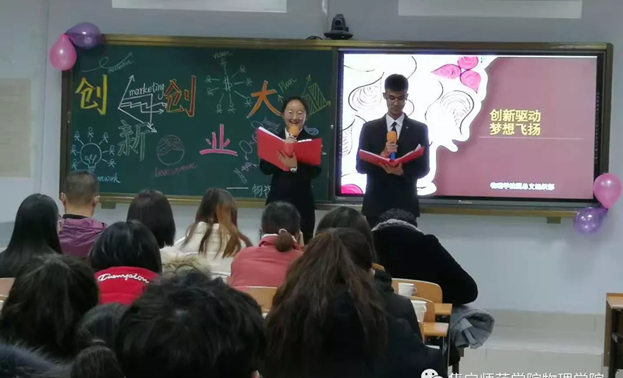 为进一步激发大学生创新创业热情,展示我校学生创新创业成果,弘扬双创青春正能量,引导广大青年积极投身建设创新型社会的伟大实践,提高学生的综合素质和实践能力,促进优秀人才的涌现和先进成果的转化,12月8日,物理学院在逸夫楼举办了“创新驱动,梦想飞扬”创新创业大赛。本次大赛获得了老师与同学们的广泛关注和参与。担任本次大赛的评委团由各个学院的学生会主席组成。