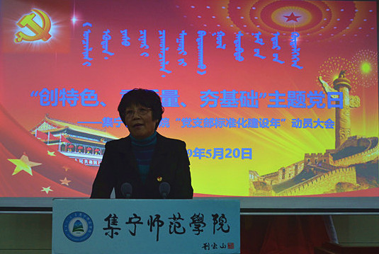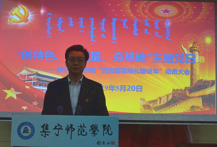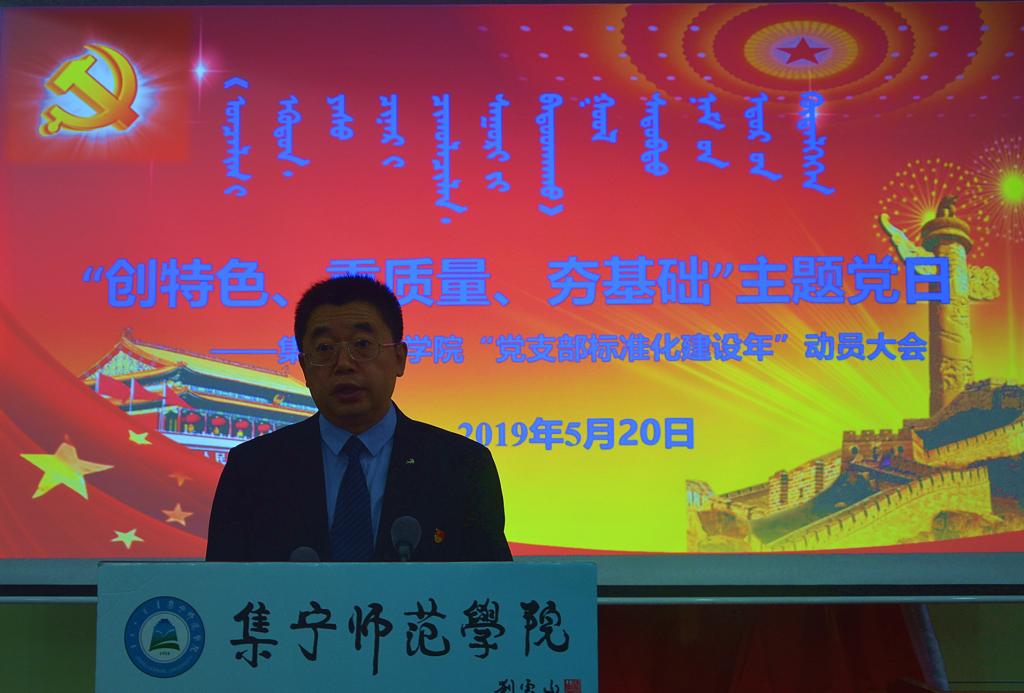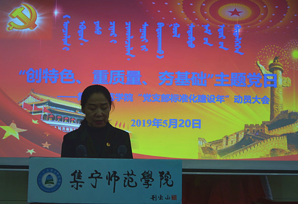 按照乌兰察布市委党建工作领导小组部署和乌兰察布市委《党支部标准化建设年实施方案》要求,进一步加强和规范党支部组织生活,5月20日,集宁师范学院在泉山校区图书馆报告厅召开“创特色、重质量、夯基础”主题党日活动暨集宁师范学院“党支部标准化建设年”动员大会。