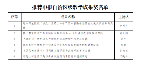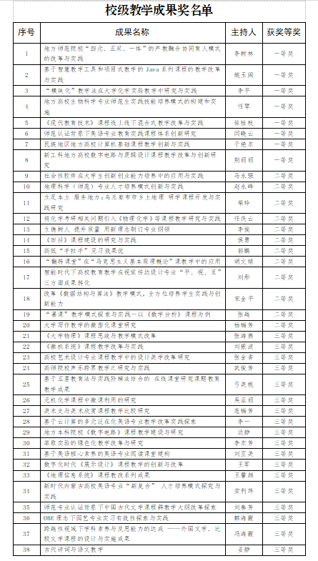 根据《关于开展2022年自治区级高等教育教学成果奖评审工作的通知》和《集宁师范学院关于组织开展2022年高等教育教学成果奖评审工作的通知》精神,经个人申报,学校组织校学术委员会网上评审、评审专家会议评审和校长办公会议审定,拟推荐“地方师范院校‘四元、五双、一体’的产教融合协同育人模式的改革与实践”等8项成果为校级教学成果一等奖,“社会性软件在大学生创新创业能力培养中的应用与实践”等12项成果为校级教学成果二等奖,“《大学物理》课程思政与教学模式改革”等18项成果为校级教学成果三等奖。其中,一等奖排名前六位的成果拟推荐申报自治区级高等教育教学成果奖。现将推荐结果予以公示。