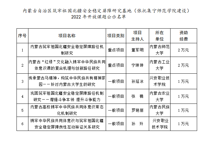 根据《内蒙古自治区筑牢祖国北疆安全稳定屏障研究基地(依托集宁师范学院建设)2022年开放课题申报通知》要求,按照有关项目管理办法,经过线上申报、形式审查及专家评审等程序,并经集宁师范学院校长办公会审议,现将评审结果公示。