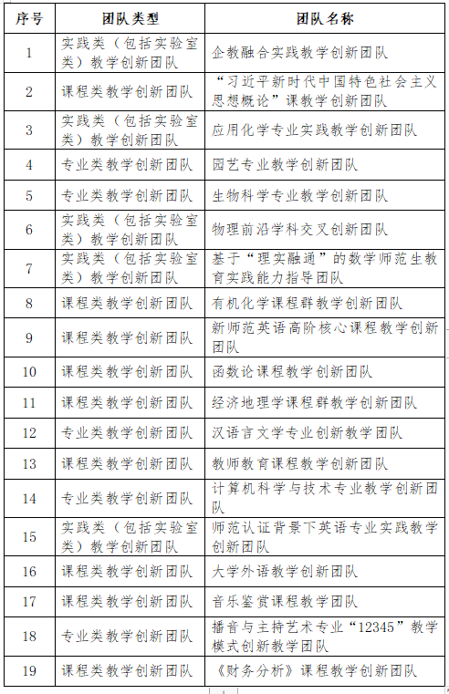 为深化本科教育教学改革,提高本科人才培养质量,打造学校高水平教学创新团队,根据《内蒙古自治区教育厅关于开展高水平教学创新团队遴选认定工作的通知》要求,经个人申报,二级学院推荐,教务处初审,学校组织专家评审,拟认定“企教融合实践教学创新团队”等19个教学团队为集宁师范学院教学创新团队,并按照评审成绩排名,拟推荐“企教融合实践教学创新团队”等前4个教学团队申报自治区级教学创新团队,具体清单如下表,现予以公示。