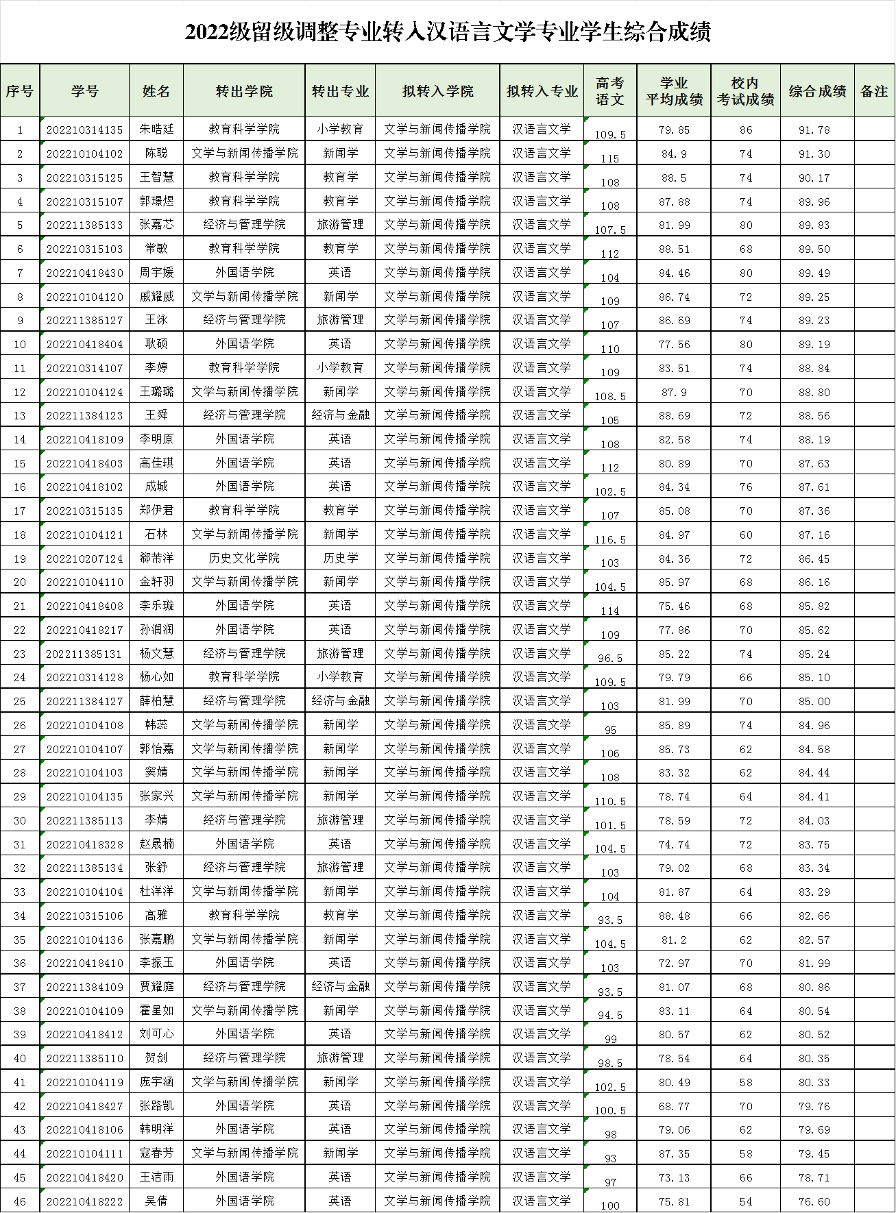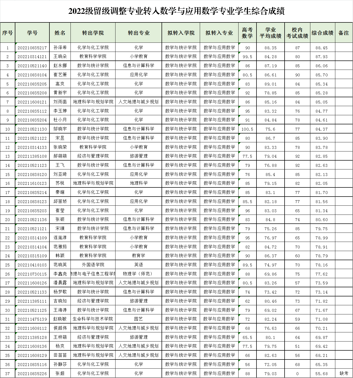 在前期校内考试成绩公示和高考语文(数学)成绩及学业平均成绩本人确认的基础上,现将2022级申请转入数学与应用数学和汉语言文学专业学生按比例核算后的综合成绩予以公示: