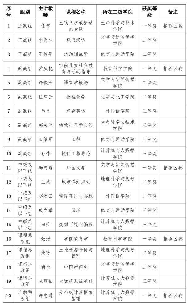 根据《关于举办第四届内蒙古自治区高校教师教学创新大赛暨第四届全国高校教师教学创新大赛内蒙古赛区选拔赛的通知》和《关于举办集宁师范学院第四届教师教学创新大赛暨第四届内蒙古自治区高校教师教学创新大赛选拔赛的通知》要求,经二级学院推荐、教务处初审、网络评审、现场评审,任琴等20位参赛选手(团队)获奖,其中获一等奖的作品推荐参加自治区赛,名单如下: