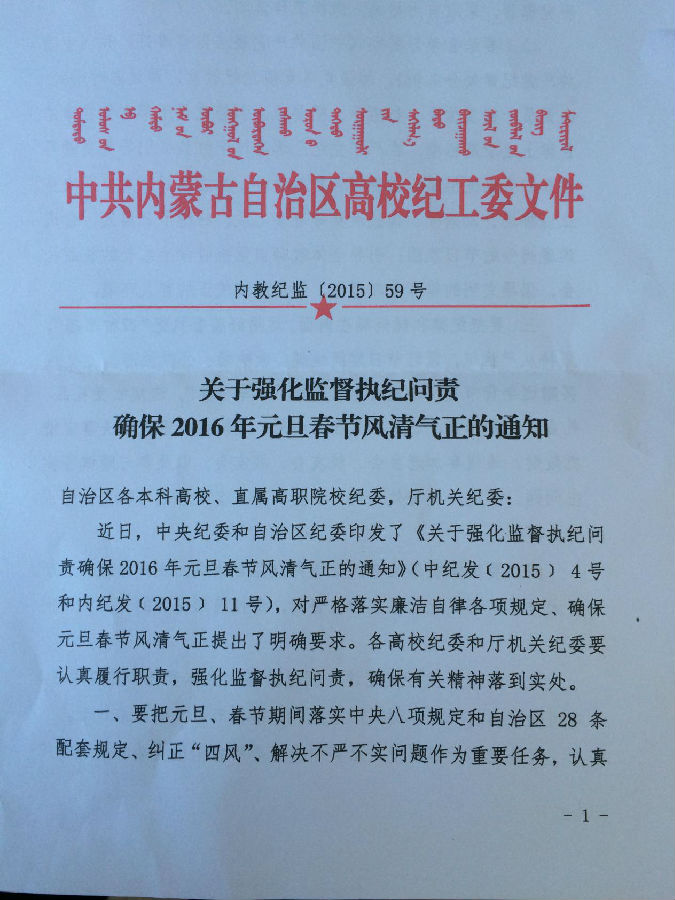 现将中共内蒙古自治区高校纪工委的《关于强化监督执纪问责确保2016年元旦春节风清气正的通知》(内教纪监〔2015〕59号)文件转发给你们,希望学校各级党组织根据文件的要求,严格落实廉洁自律的规定,确保元旦春节风清气正。充分发挥纪委委员、纪检委员的监督、执纪、检查作用,调动党员干部的积极性和自觉性,按“三严三实”的要求强化监督执纪问责,确保有关精神落到实处。