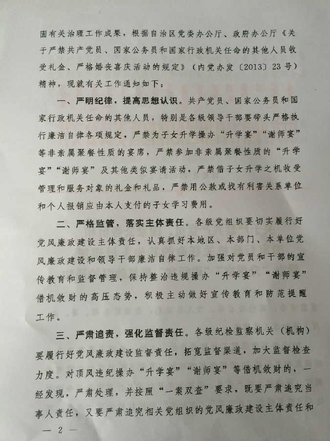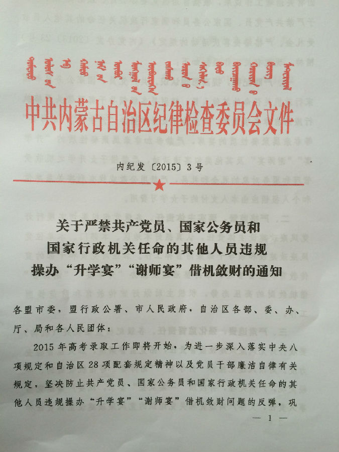 附件:自治区纪委《关于严禁共产党员、国家公务员和国家行政机关任命的其他人员违规操办“升学宴”“谢师宴”借机敛财的通知》(内纪发〔2015〕3号)