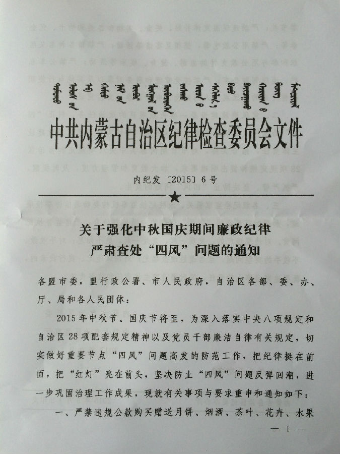 附件:自治区纪委《关于强化中秋国庆期间廉政纪律严肃查处“四风”问题的通知》(内纪发〔2015〕6号)