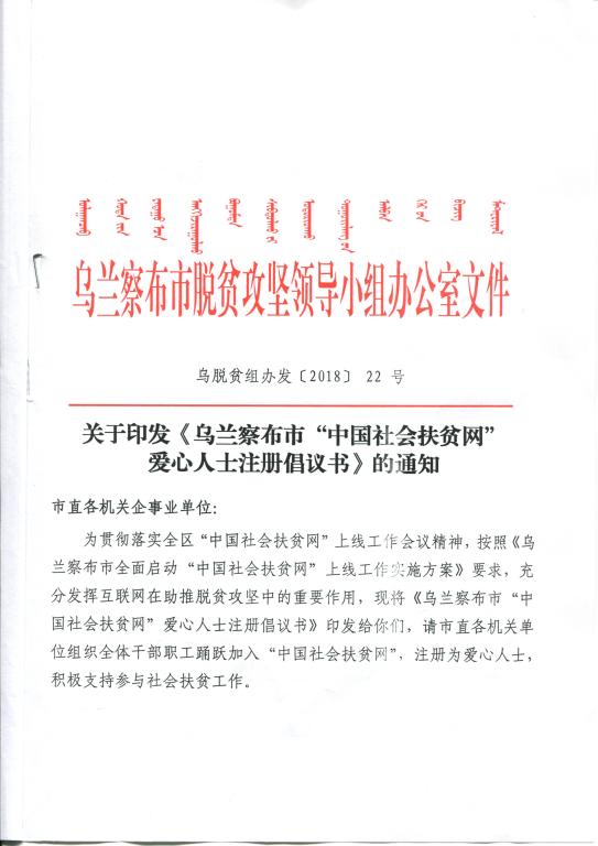 附件:1.关于印发《乌兰察布市“中国社会扶贫网”爱心人士注册倡议书》的通知