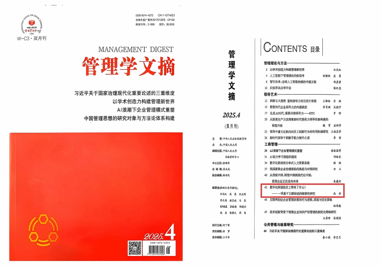 发表于《集宁师范学院学报》(2025年第2期)的文章《数字化转型给员工带来了什么?——一项基于文献综述的探索性研究》被人大复印报刊资料《管理学文摘》(2025年第4期)全文转载,文章作者为集宁师范学院经济与管理学院副教授、科技处副处长尚妤博士。
