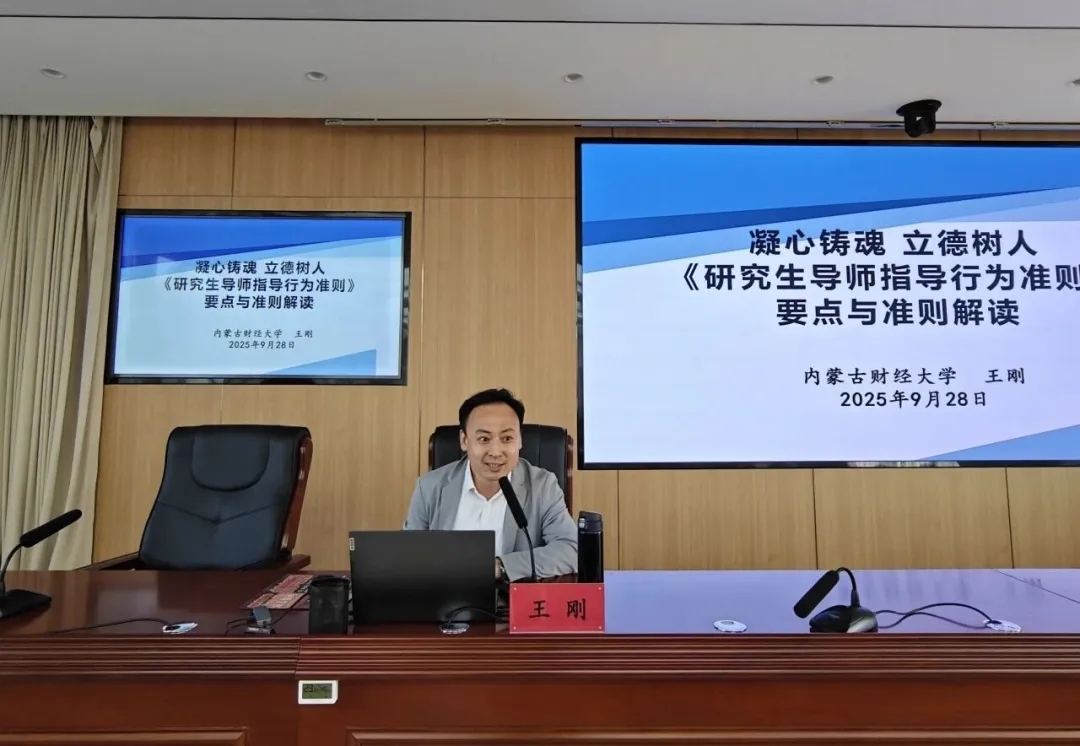 王刚教授以《凝心铸魂 立德树人—<研究生导师指导行为准则>要点与准则解读》为题,从《准则》出台背景、核心要点和操作指南三个维度,系统解读了新时代研究生导师的职责边界与行为规范。王刚教授结合具体案例,深入剖析了思想引领、招生规范、过程指导、学术诚信、论文质量、经费管理、师生关系等关键环节,强调了相关工作“十不得”底线要求和“全过程育人”的实践路径,为我校研究生导师队伍建设提供了宝贵的理论指导和实践参考。
