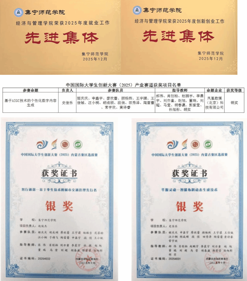 我院坚持“就业优先、创业赋能”理念,2025年就业创业工作再传捷报!毕业生就业率稳居全校第一,创业工作综合排名全校第三。在2025年中国国际大学生创新大赛中,我院创客协同创新中心组织团队奋勇出征,实现我校产业赛道零突破!“智行通途”“华服灵动”两大项目过关斩将,斩获内蒙古赛区银奖;其中“华服灵动”项目一路晋级国赛,在全国总决赛中凭借出色的创新能力和扎实的项目表现斩获铜奖,创下我院赛事历史最佳成绩,充分彰显了我院创新创业人才培养的显著成效!