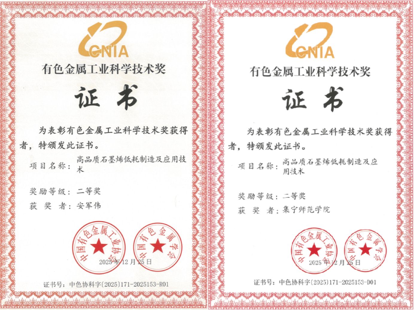 近日,集宁师范学院石墨烯研究院安军伟团队在高质量石墨烯低消耗制备及应用技术上取得关键突破,相关项目荣获2025年度中国有色金属工业科技进步二等奖。该奖项是我国有色金属行业最高级别科技奖项之一,并在国务院奖励办公室备案,旨在表彰在行业技术进步、成果转化等方面做出突出贡献的集体与个人,具有重要的行业影响力与公认度。